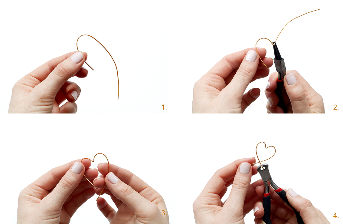 1. À la main, recourbez le fil d’aluminium, de façon à former la première courbe du coeur. 2. Réalisez le creux du coeur à l’aide de la pince à bouts ronds. 3. Formez ensuite la deuxième courbe du coeur à la main. 4. Réajustez la taille du coeur et coupez l’excédent de fil.