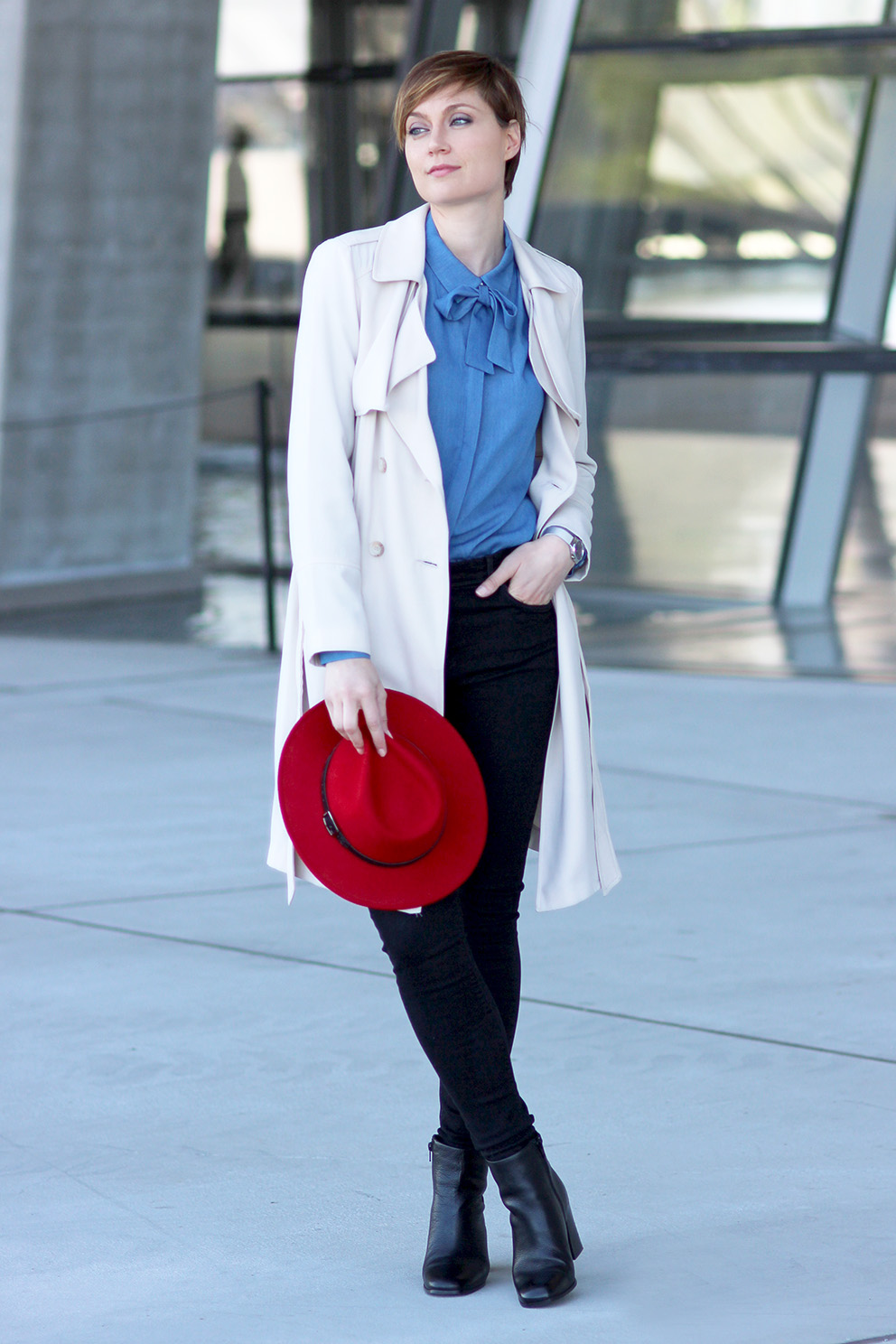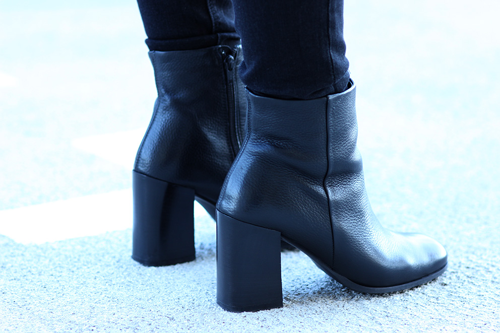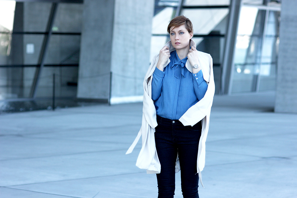 Malgré toutes ces belles choses, je fais quand même ma petite chauvine et publie aujourd’hui ce look, shooté à Lyon il y a quelques jours. Le coup de coeur de cette tenue ? Ma chemise lavallière en jean, que j’ai trouvé chez Kiabi. Oui, oui, Kiabi ! Je me surprends de plus en plus à découvrir de jolies choses, là-bas. Ils ont bien redressé la marque, que ce soit en terme de coupe, de tendance et de qualité. Je tente aussi pour la première fois « les chaussures aux talons cubains », motivée par mon stagiaire fou-fou, Boris, qui m’a dit « Mais si, va-z-y, c’est vachement tendance, les talons cubains ! ». Bon bah si c’est tendance alors… il faut toujours écouter les p’tits jeunes, il parait ! Ha ha !