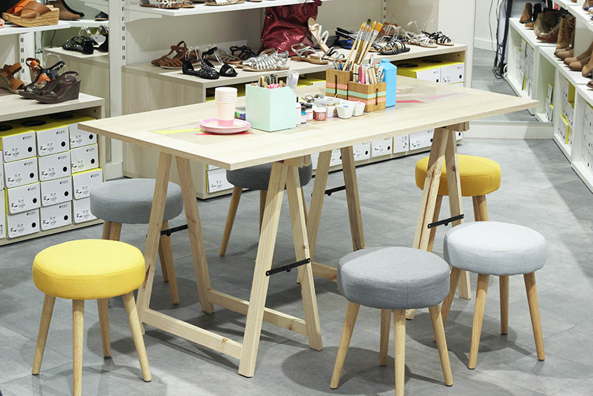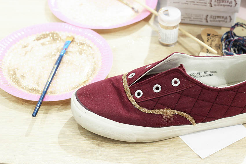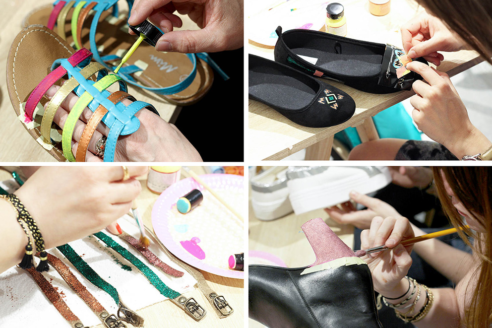 atelier diy Artlex mode lyonHello les amies ! Comme promis, voici quelques photos de l’atelier DIY que j’ai animé pour la marque Eram, le samedi 7 mai dernier. C’était vraiment top !  Toute l’équipe de la boutique Eram Part-Dieu avait mis les petits plats dans les grands pour que l’on passe un moment chaleureux entre nous. Toutes les participantes avaient joué le jeu en ramenant une paire de chaussures -vieilles ou neuves-, afin de redorer leur blason ou de les ennoblir d’une touche de folie ! Grâce au matériel mis à disposition par mes deux formidables partenaires le e-shop Adam et La petite Epicerie, les filles ont vraiment pu se lâcher dans leur réalisation ! À grands coups de peintures sur cuir Angelus, de rubans Liberty, et de paillettes, les chaussures reprenaient vie comme par magie ! Pour ma part, j’ai adoré alterner les moments de discussions entre filles, phases de concentration, petits conseils et éclats de rire, le tout sur fond sonore de sèche-cheveux. Et oui, il fallait bien faire sécher toutes ces paillettes !