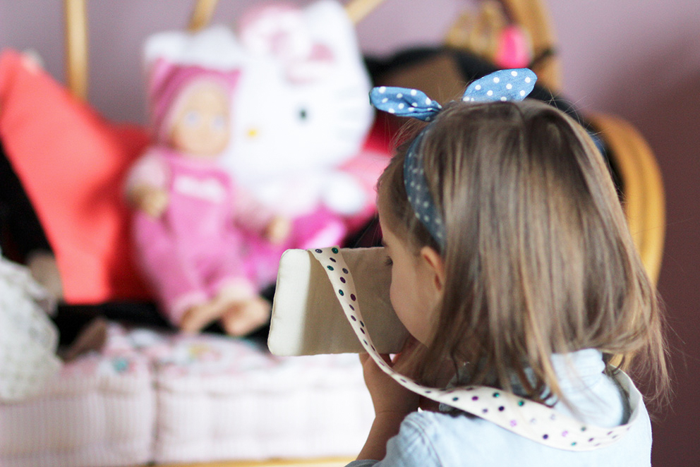 En voilà une qui est déjà une grande adepte des photos ! Et pour cause, Emma baigne dedans depuis qu’elle est toute petite. Alors forcément -comme les chats ne font pas des chiens, hein ?- ma fille ne rate jamais l’occasion de me piquer mon réflexe pour simuler une séance photo, comme le témoigne cette image qui date déjà de l’année dernière. « Ouististiiiii ! Maman, souris !!! Non, t’as pas souris, là. t’as fermé les yeux, pffff ». Même si elle n’arrive pas encore à faire marcher l’appareil, elle y croit cependant dur comme fer. Du coup, l’idée m’est venue de lui créer un faux appareil avec ce que j’avais sous la main, histoire de lui faire passer le temps jusqu’à son premier appareil photo. À deux ans et demi, les enfants sont encore si naïfs et ils s’inventent des histoires avec rien, alors j’en profite encore un peu. 😉 Si vous avez aussi un ou une petite artiste en herbe à la maison, je vous livre les étapes de ce DIY simple, mais bourré d’amour.