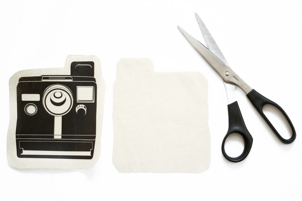 Découpez le contour de votre transfert à 1 cm (ou 1,5 cm) du bord, puis découpez la même forme en miroir, dans votre tote bag. Vous obtenez l’avant et l’arrière de votre appareil photo.