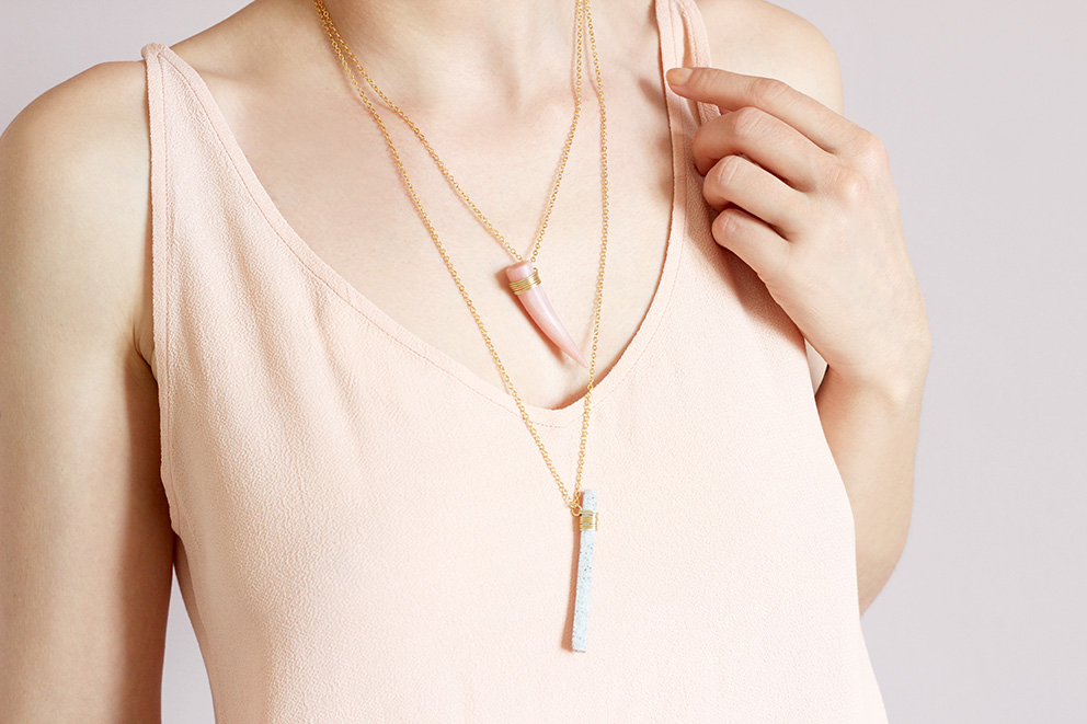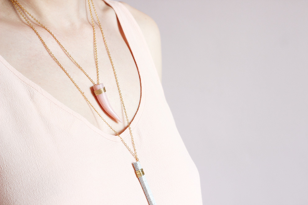 comment faire un bijoux chicPassons aux dernières étapes. Avec la pince coupante, coupez un morceau de fil de cuivre d’environ 20 cm de longueur et enroulez-le fil autour de votre corne. Glissez-y le petit anneau, et fixez le tout avec quelques petites pointes de colle forte. Faites ensuite la même manipulation avec votre rectangle « en granit ».