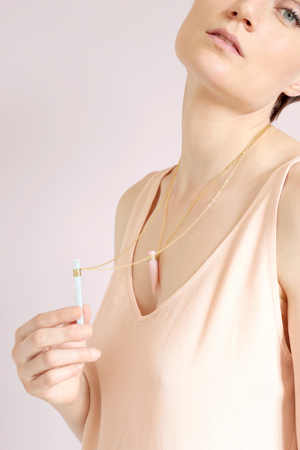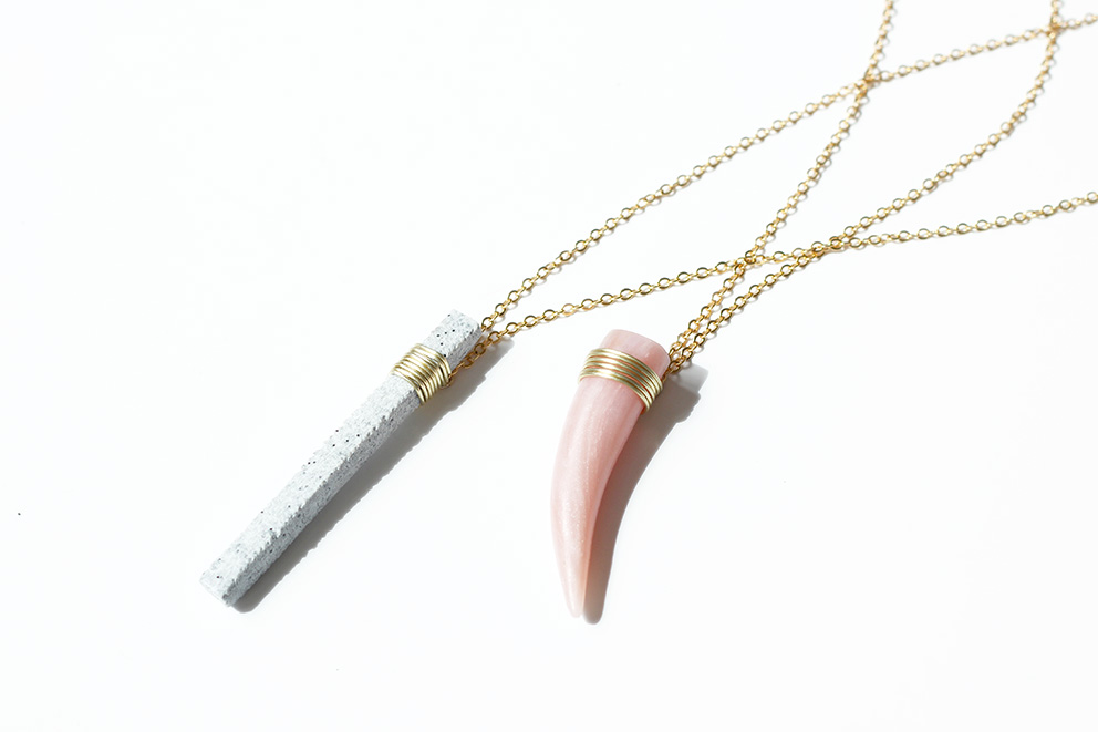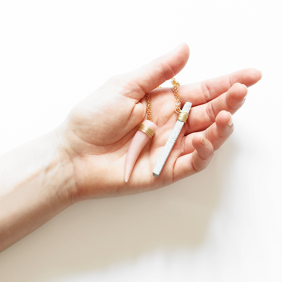Du coup, j’y remédie aujourd’hui en vous dévoilant le DIY que j’ai imaginé spécialement pour mes ateliers créatifs avec la marque 1.2.3 Paris. Mon idée était de faire réaliser aux participantes un bijou avec un pendentif en pierre et du fil de laiton enroulé autour. Mais très vite, je me suis rendue à l’évidence qu’acheter 120 pierres (pour 120 participantes) allait me coûter TRES très cher. Coup de panique ! Comment allais-je pouvoir réaliser mes ateliers si je n’avais pas les fameuses pierres ? je vous avoue que j’ai beaucoup réfléchi et que je n’en ai pas beaucoup dormi. D’insomnies en pensées, ma réflexion a cheminé vers une drôle d’idée : réaliser mes propres pierres. Mais avec quoi ? Je ne suis ni tailleuse de pierre, ni orfèvre, moi ! Alors, j’ai pensé à la Fimo, cette pâte à modeler qui durcit lorsqu’on la cuit, et j’en ai acheté quelques paquets pour faire des essais. Ho oui, qu’il y a eu des ratés ! Pour jauger de la crédibilité de mes « pierres », il n’y a pas meilleur juge que mon amoureux, qui m’a regardé plusieurs fois d’un oeil dépité en me disant « Franchement, tu ne peux pas proposer ces… trucs, pour tes ateliers »… Ok. Il a fallu que je creuse davantage, que je pousse mes techniques. C’est comme ça que mes petites cornes sont nées, et j’en ai créé 120. Mais en bonne maso que je suis, j’ai voulu imaginer un deuxième modèle, et tomber sur une seringue de modelage à vis m’a bien aidé. Bingo, j’ai réalisé aussi 120 barres de béton.