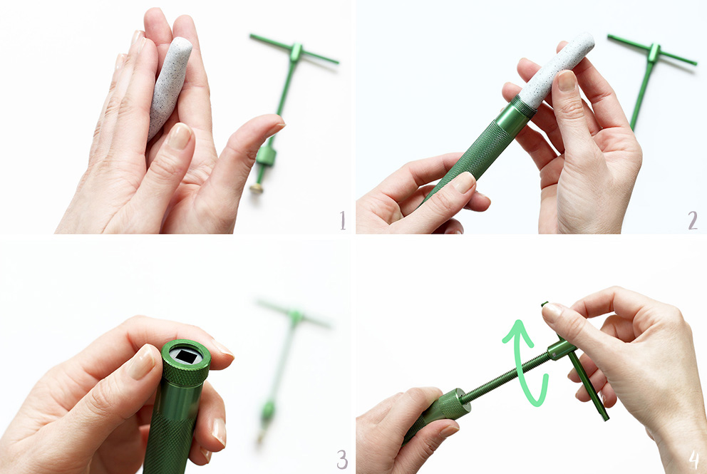comment utiliser la pate fimo1. Faites un « boudin » avec votre pâte à modeler. / 2. Glissez le boudin dans le tube de la seringue de modelage. / 3. Au bout de celle-ci, vissez le « disque à enforme » de votre choix (le kit