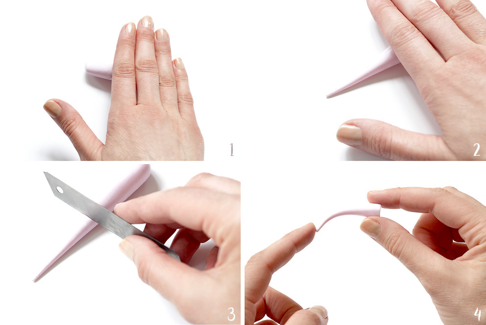 creation bijoux pate modeler à cuire1. Faites rouler votre boule de pâte à modeler sous vos doigts (et/ou votre paume), jusqu’à l’obtention d’une forme conique. / 2. Lorsque celle-ci se dessine, accentuez la forme de votre cône en la faisant rouler sous la paume de votre main, pour en affiner le bout. / 3. Avec votre lame de cutter, coupez net votre cône à 6 cm de longueur. 4/ Tenez le bout le plus large entre vos deux doigts, et avec l’index de l’autre main, repliez légèrement la pointe du cône, de manière à obtenir une corne.