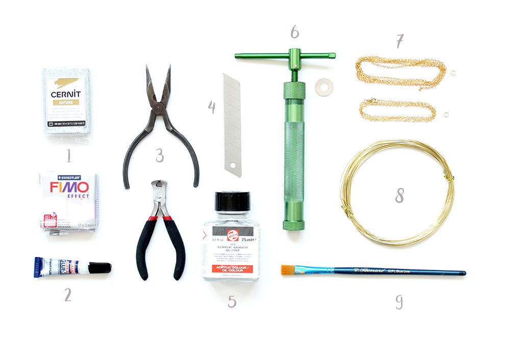 1. Un paquet de pâte Cernit effet granit et un paquet de pâte Fimo effet quartz / 2. Un tube de colle forte / 3. Une pince plate et une pince coupante / 4. Une lame de cutter / 5. Du vernis pour pâte Fimo / 6. Une seringue de modelage à vis / 7. Deux chaines de 50 cm (pour confectionner deux colliers) / 8. Du fil de cuivre couleur or / 9. Un pinceau