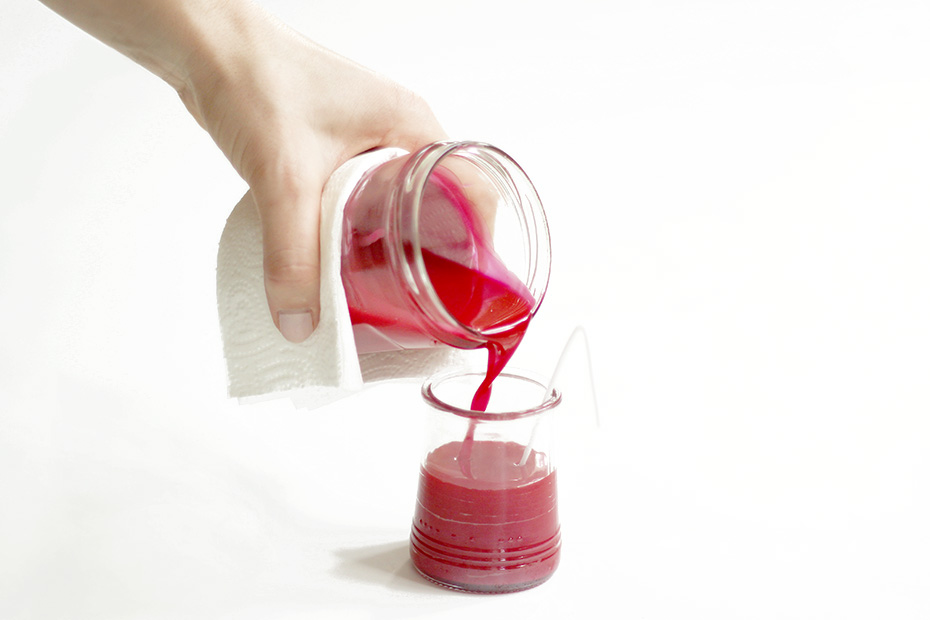 Il est temps de verser la cire ! Placez la mèche sur le côté, et remplissez votre pot de yaourt.