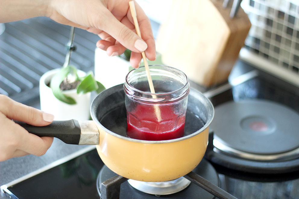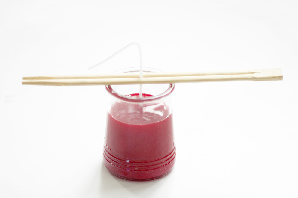 Pour maintenir la mèche au centre de la bougie, coincez-la entre les deux baguettes chinoises ! Il faut compter environ deux heures pour que la cire durcisse.