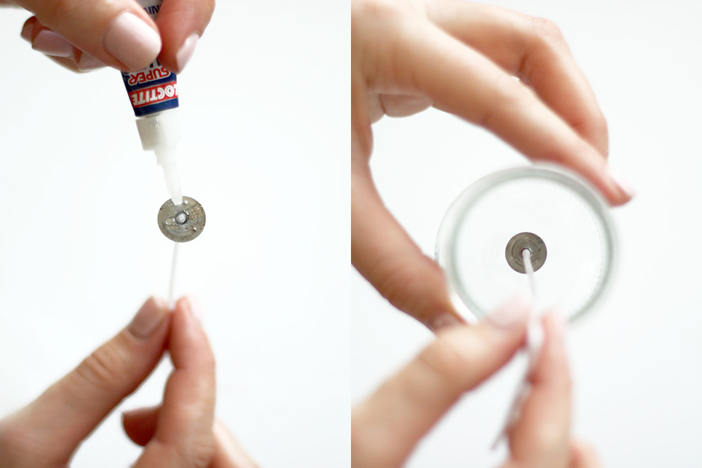 Pendant que la cire fond, collez la mèche à bougie avec de la colle forte, au fond du pot de yaourt, au centre.