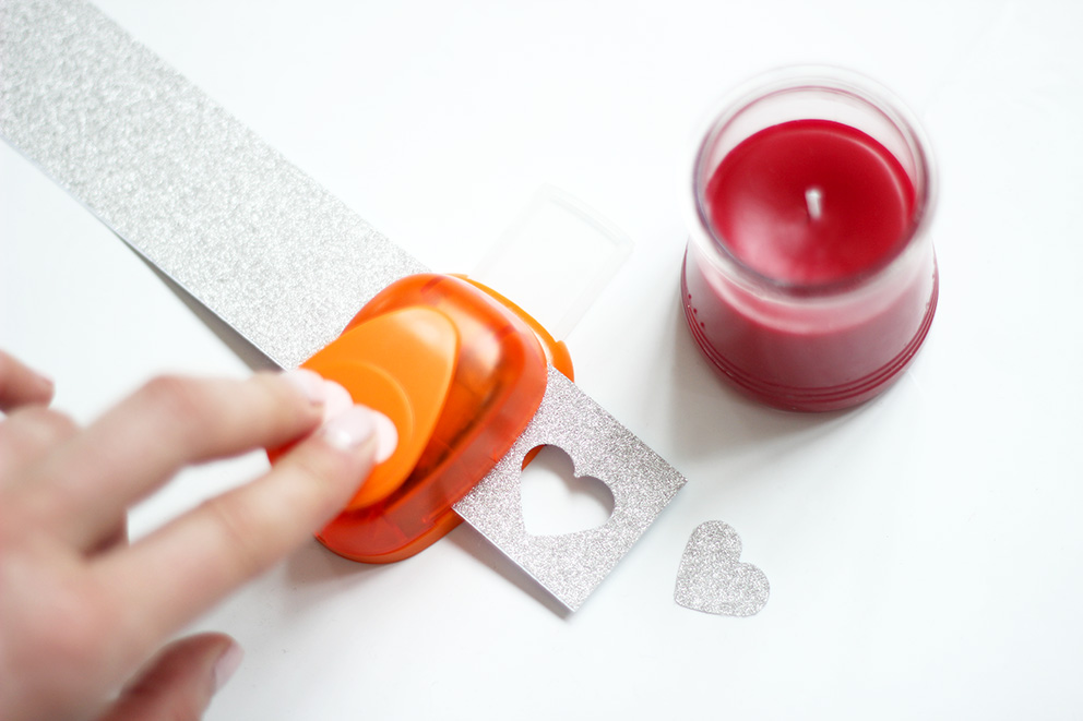 Allez, comme c’est la Saint Valentin, on se paye le luxe de rajouter un petit coeur ! Ainsi, découpez ou perforez un joli coeur dans votre papier pailleté autocollant. (Si vous n’avez que du papier normal, collez-le avec de la colle).