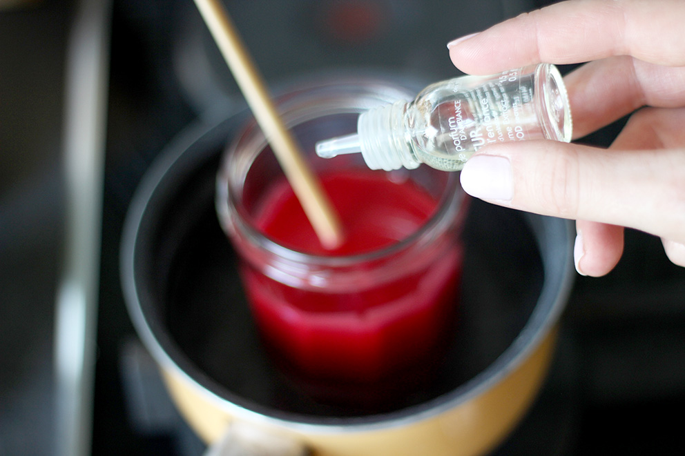 Ajoutez-y quelques gouttes d’huiles essentielles, pour que votre bougie sente bon, et mélangez.