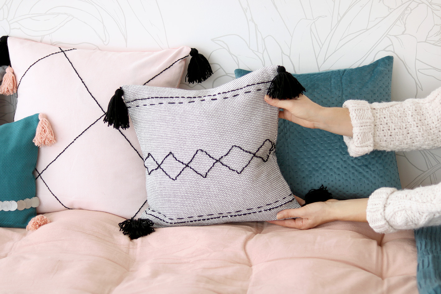 Une fois les quatre pompons réalisés, cousez-les aux extrémités du coussin. Ils finiront à merveille votre création berbère !