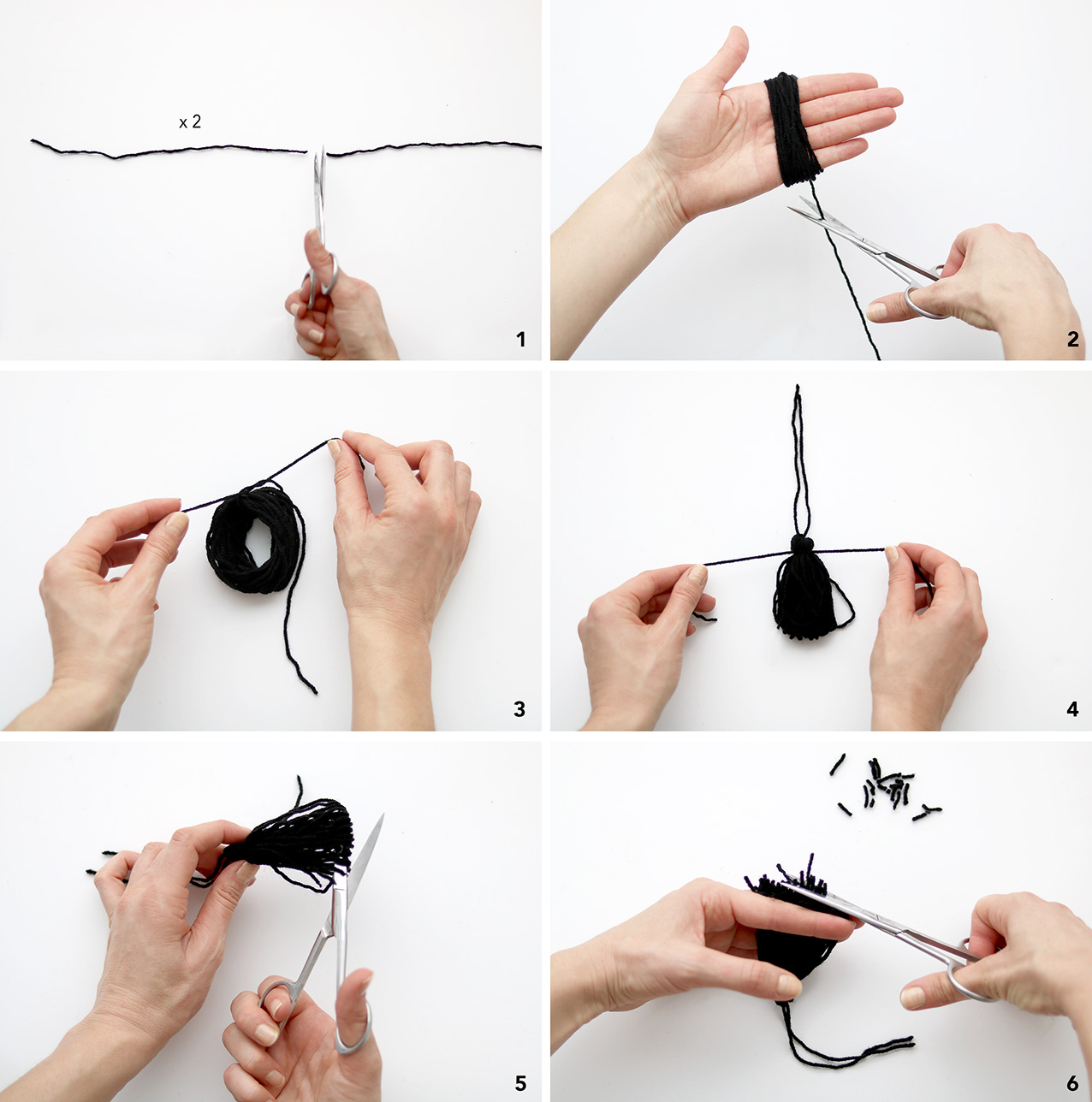 Passons maintenant à la réalisation des pompons. Il vous faudra en réaliser quatre, pour les quatre côtés du coussin ! Voici les étapes pour réaliser un pompon : 1. Coupez 2 fils d’environ 20 cm chacun et mettez-les de coté. 2. Enroulez généreusement du fil de laine autour de votre main, à l’endroit où elle est la plus large. Plus vous ferez de tours, plus votre pompon sera épais. Ensuite, coupez le fil. 3. Prenez l’un de vos deux morceaux de fil, et faites un noeud autour de votre « tourbillon de laine » afin de maintenir les fils ensemble. 4. Amassez tous les fils dans le même sens, prenez le deuxième morceau de fil, puis enserrez le haut des fils afin de former la tête du pompon. 5. Coupez l’intérieur du « tourbillon de laine » pour libérer les brins du pompon. 6. Egalisez les pointes du pompon.