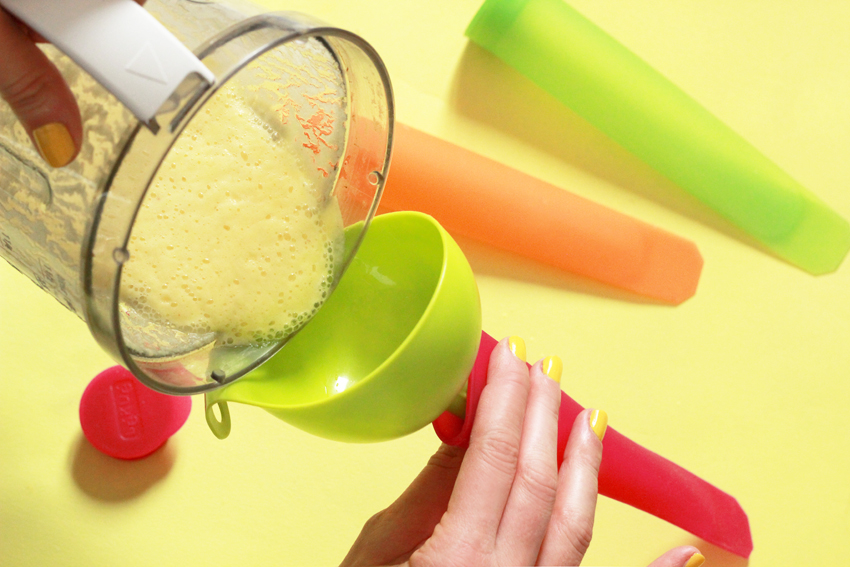 Versez votre smoothie maison dans les moules en silicone, en vous aidant de l’entonnoir.