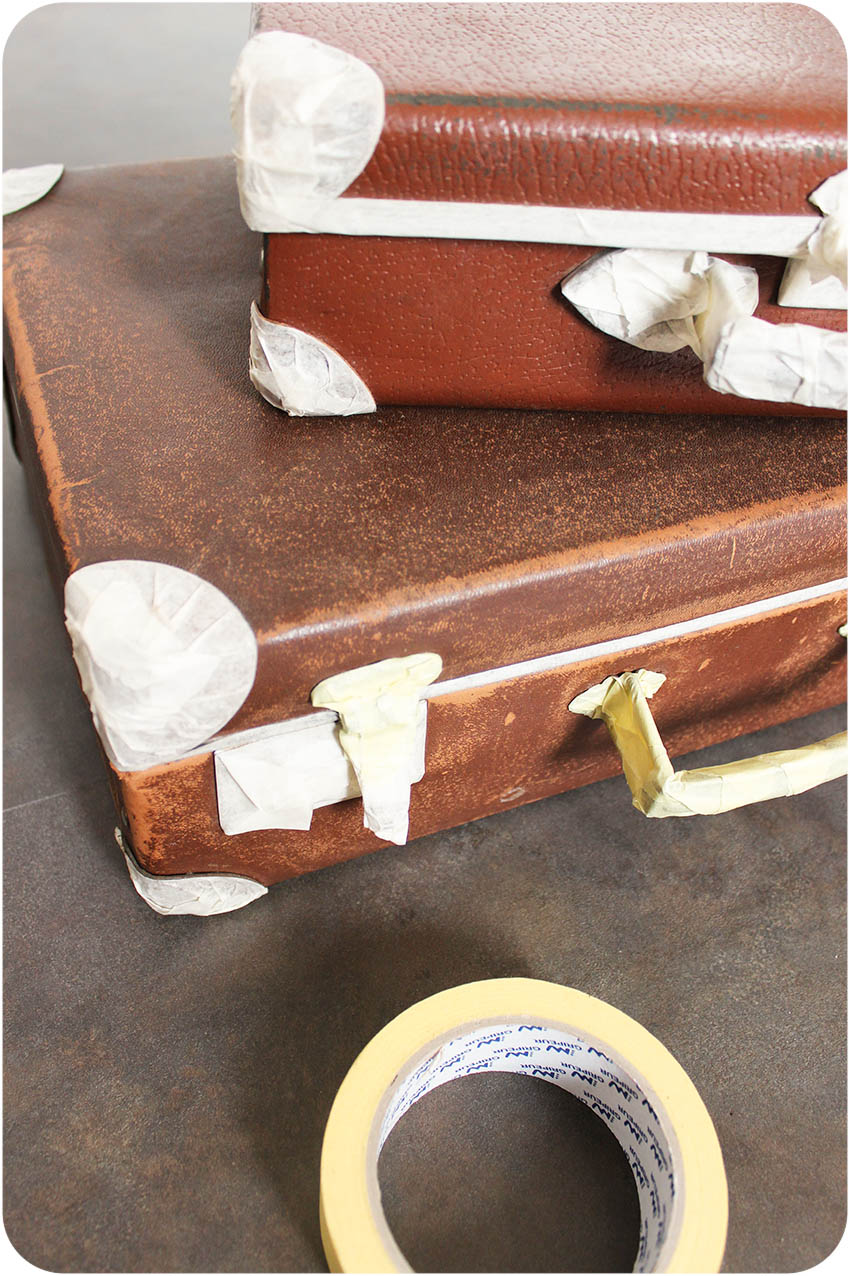 Plusieurs méthodes sont envisageables, mais pour ma part, j’ai glissé la valise dans un grand sac poubelle, fait des trous dedans pour faire émerger les parties à bomber, et j’ai rescotché l’ensemble. On bombe, on laisse sécher, puis on retire toutes des protections.