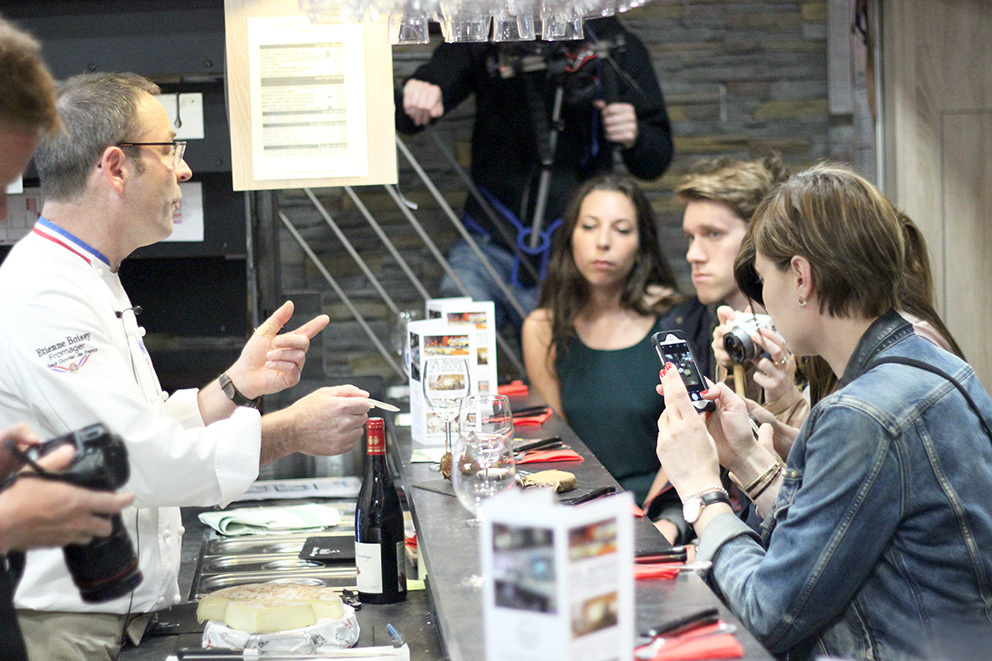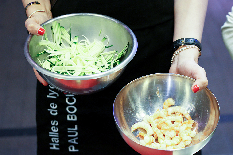 atelier cuisine halles de lyon atelier de cuisine lyon recette julienne de courgettes et crevettes au pesto julienne de courgettes et crevettes au pestoAvant-dernière étape du parcours : le FROMAGE ! Et oui ! Étienne Boissy, un des meilleurs fromagers de France s’est amusés avec la place qu’il restait dans nos estomacs. Il nous a donc fait déguster et apprécier les couples mythiques de notre gastronomie française entre les fromages et les vins.