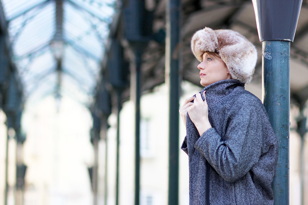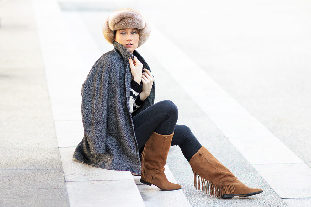 Concernant le look que j’aborde dans cette série photo, j’honore deux boutiques lyonnaises qui me sont chères : la première est la boutique de chapeaux Bon Clic Bon Genre, dont je vous ai déjà parlé plusieurs fois. Pour cette saison, elle propose un large choix de chapkas, et j’ai fondu pour ce modèle en fausse fourrure toute douce qui donne une allure dingue. La deuxième boutique est celle de Loreak Mendian, une marque espagnole ultra urbaine, dont j’adore les coupes et les matières. Le manteau que je porte en est la preuve parfaite. Je vous ai glissé les deux adresses à la fin de l’article. Je vous présente aussi mon dernier coup de coeur chaussures : ces bottes à franges dénichées sur le site Sacha. Ce e-shop issu des Pays-Bas n’est pas très connu des Français, et pourtant, la qualité des produits est vraiment très bien. Je ne suis jamais déçue des produits, c’est pourquoi je n’en suis plus à ma première commande.^^