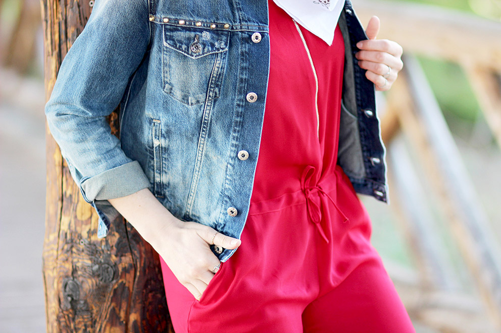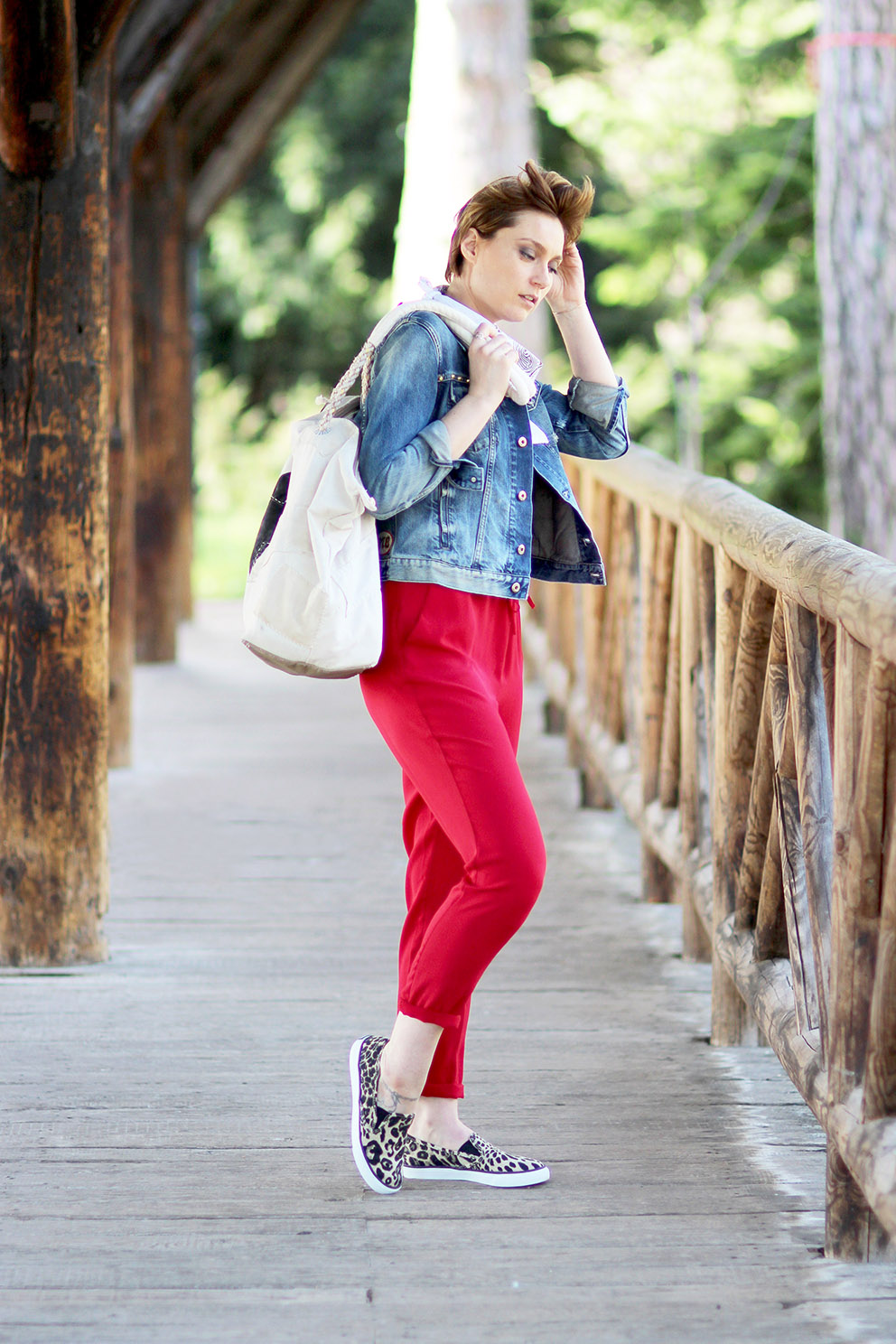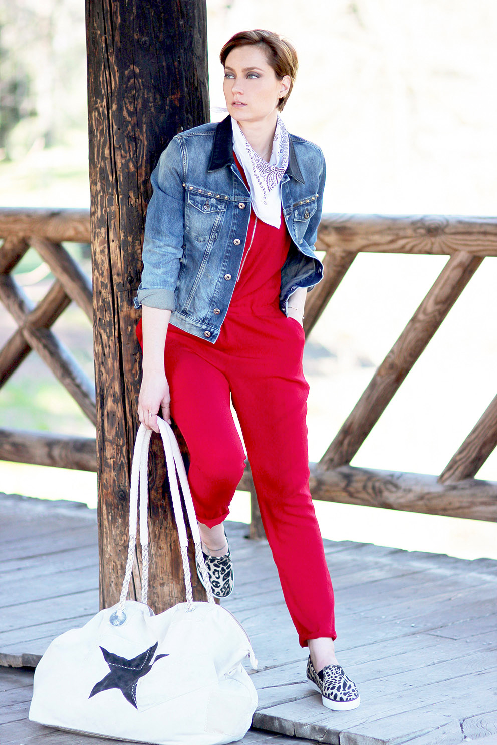 Mais parlons look ! J’ai profité de quelques éclaircies pour sortir du placard ma nouvelle combinaison rouge. Je commence vraiment à prendre goût au format « une pièce », si confort et facile à accessoiriser. Dans le style « effortless », on ne fait pas mieux ! J’y glisse ma petite touche de fun avec de chouettes tennis léopard aux pieds. 🙂