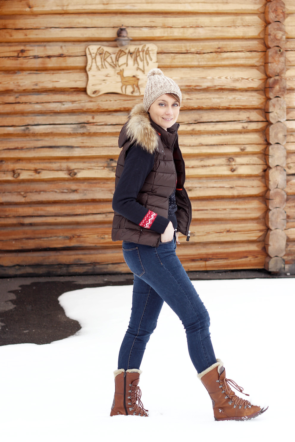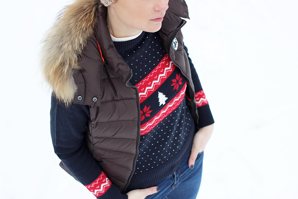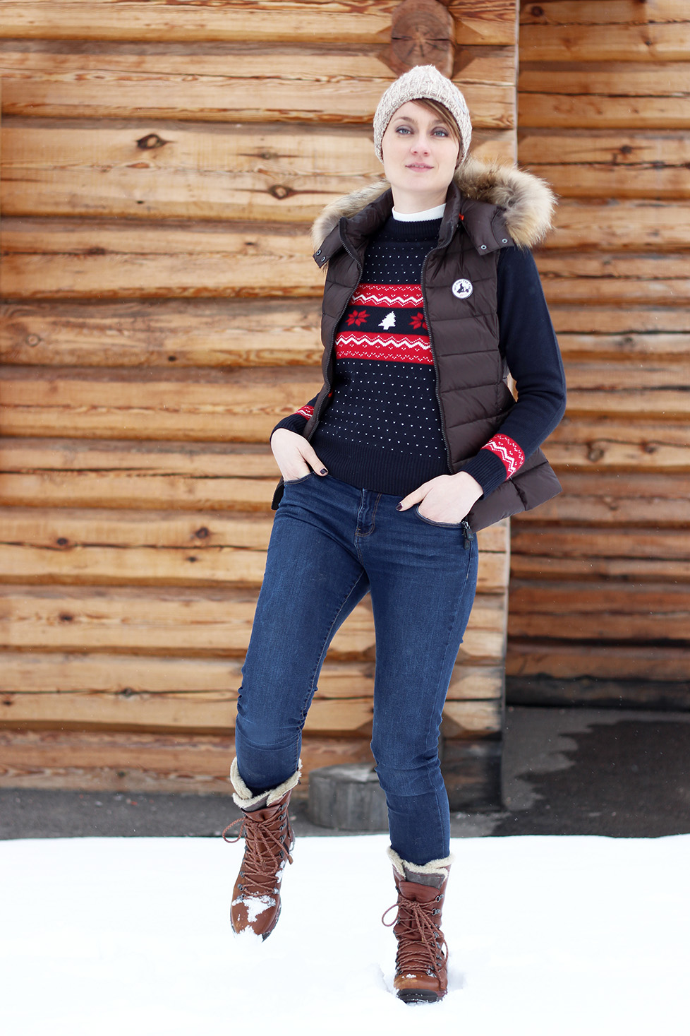 Voici donc mon deuxième look de montagne, shooté durant nos dernières vacances dans les Alpes. En route pour aller découvrir le village d’à côté, nous avons profité de ce qu’Emma dorme dans son siège bébé pour faire une halte devant de très beaux chalets, et prendre ainsi quelques photos. Je porte ici ma doudoune Jott, chaude (90% en plume !) et facile à glisser sous un manteau. Autant dire qu’elle ne m’a pas quitté du séjour. Pour le côté fun, j’ai aussi beaucoup porté mon pull bien kitsch, façon Marc Darcy (souvenez-vous, dans Bridget Jones…). De quoi s’intégrer parfaitement dans le décor ! Mes bottes Merrel, quant à elles, ont joué à la perfection le rôle de Chaussures-de-marche-au-top-pour-la-neige. Ainsi équipée, je peux vous dire que le froid, là-bas, je ne connaissais pas. Alors, pleeease, take me back !