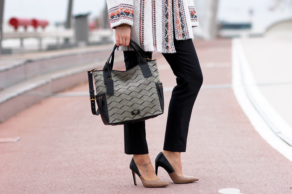 Voici un look photographié un jour de planning chargé. Ce matin-là, les talons étaient de sortis (et les baskets, glissées dans le sac). Pour contourner la tenue classique, j’avais associé mon gros gilet imprimé ikat – plutôt qu’une veste de costume – à mon pantalon de tailleur noir. Exit, l’effet guindé. Chaud et confortable, l’ensemble n’en était pas moins esthétique pour courir de rendez-vous en rendez-vous. C’était parfait pour le temps frisquet qu’il faisait. 🙂