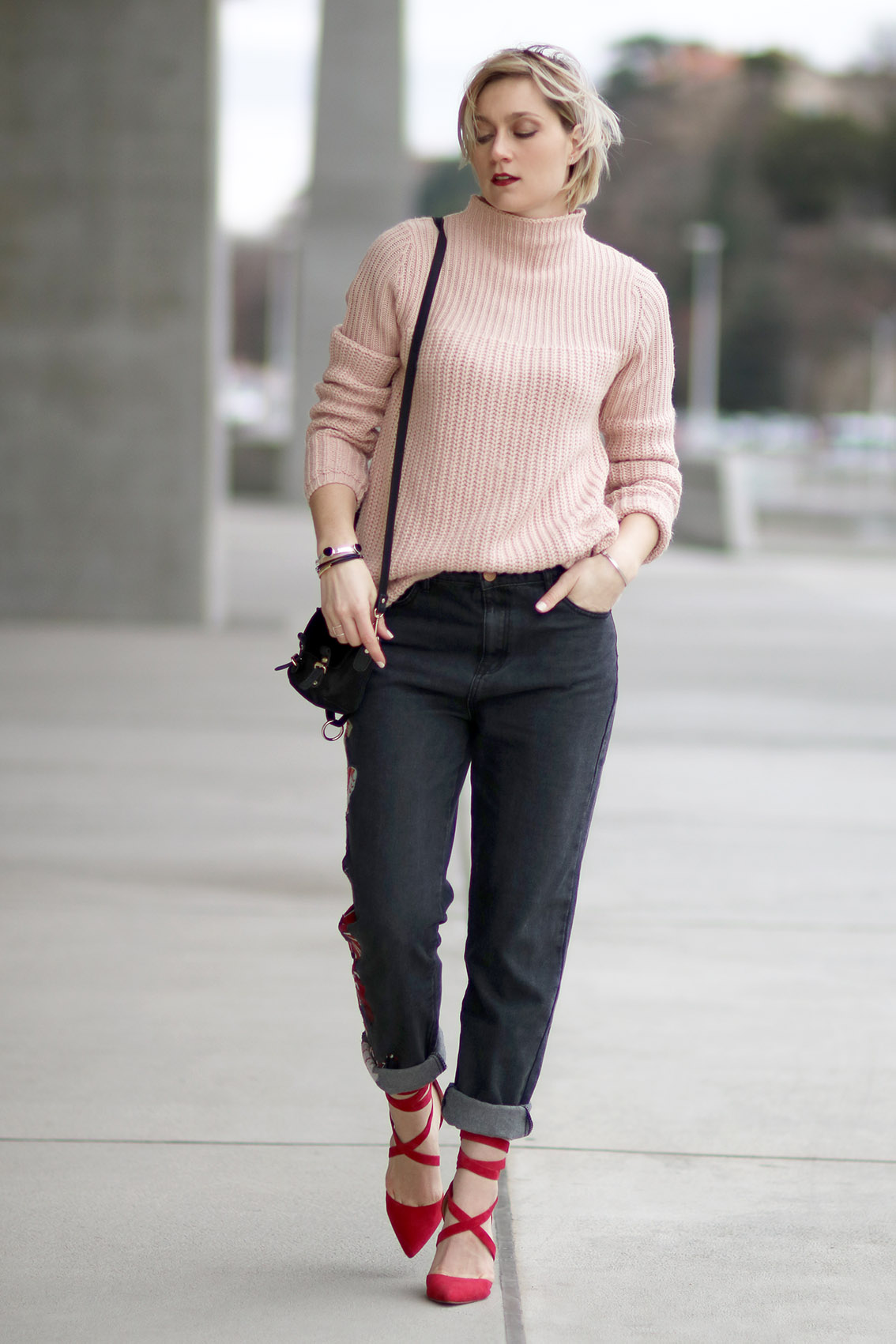 Alors voilà, cette petite erreur de parcours désormais rectifiée, je peux enfin vous parler de la nouvelle tendance qui voit le jour : la mode rose-rouge, aperçue lors de la dernière Fashion Week. C’est un peu comme l’association du bleu marine et du noir, on aime ou on deteste. Personnellement, je n’avais pas d’avis sur la question, car en mode, j’aime bien tester avant de me prononcer. J’ai donc profité de recevoir ces magnifiques chaussures rouges, pour les marier avec un pull rose, histoire de savoir si on était dans le « visuellement-correct ». Pour éviter une transition trop franche, j’ai triché un peu en y interposant un boyfriend jean dont la broderie reprend les deux couleurs. Associé comme cela, je trouve que le résultat est assez sympa, et je suis même prête à réitérer l’expérience avec d’autres tenues. Et vous, seriez-vous prête à adopter la tendance rose-rouge ?